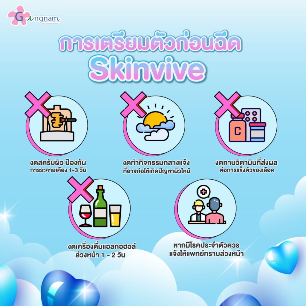 - เลือกฉีดกับคลินิกที่มีการใช้ตัว Skinvive ของแท้ มีการสั่งซื้อจากทางบริษัทอัลเลอแกน (ประเทศไทย) เท่านั้น